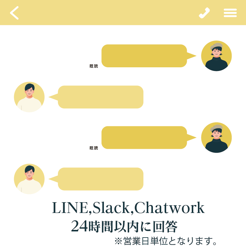 LINE、SlackまたはChatworkといったメッセージアプリでふと質問したいことが出てきた瞬間に弁護士に質問を投げておけます。また、代表者からだけでなく、法務担当者からのお問い合わせにも対応しております。